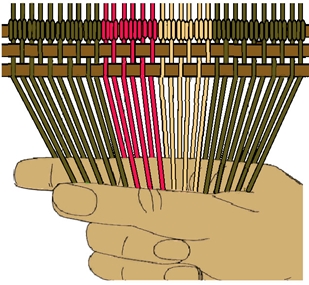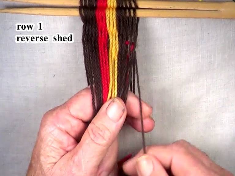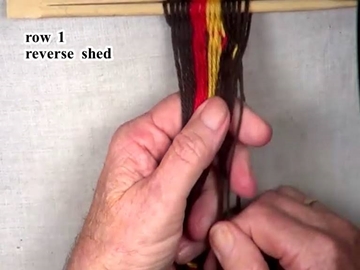 [NOTE] picking up the next bottom layer warp strand and placing it in the top layer can help keep the strand in the over under cofiguration when the shed is reversed.