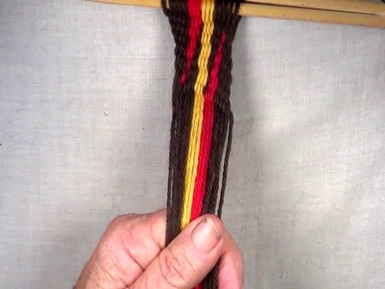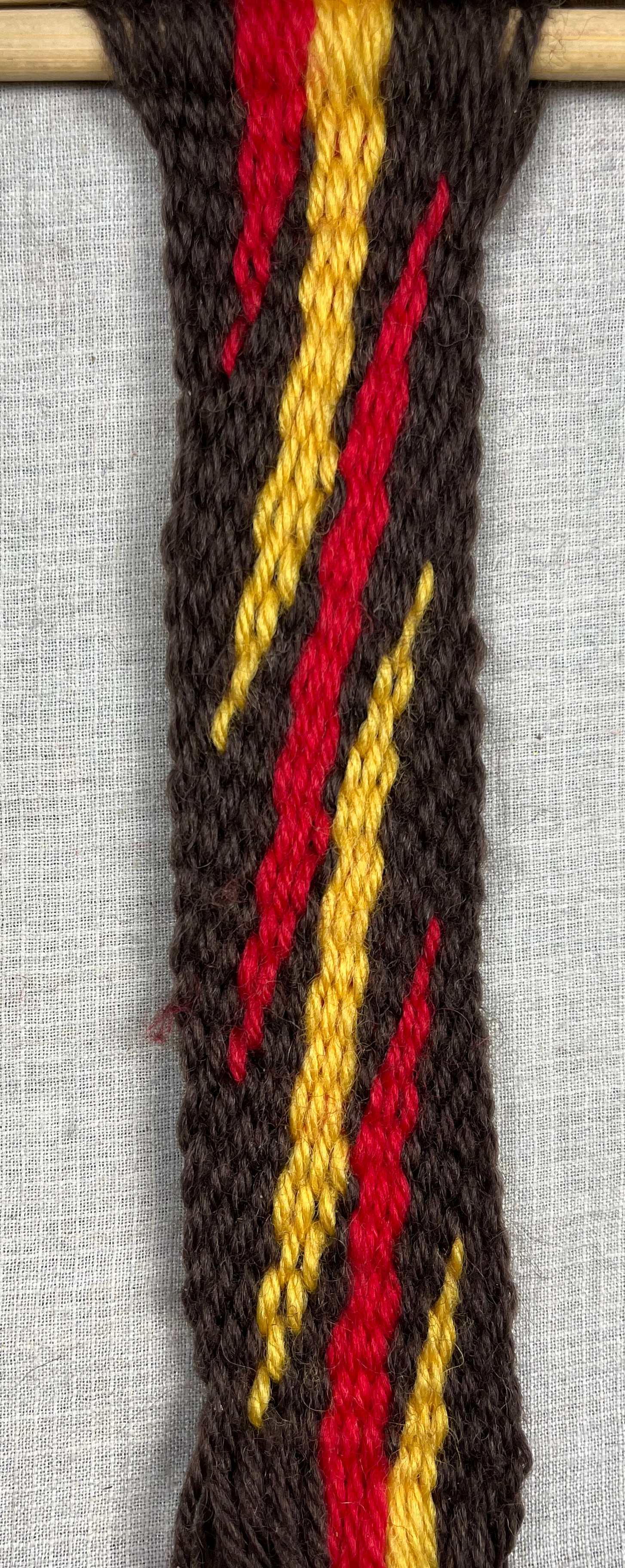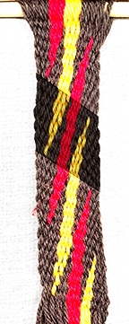 [OBSERVE] The original configuration of the warp strands was [10 brown, 6 red, 6 yellow, 10 brown]. The warp strands that make up the lightning pattern are now back together, but the color sequence is reversed [10 brown, 6 yellow, 6 red, 10 brown].