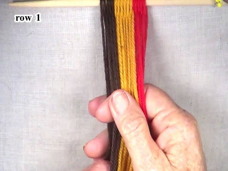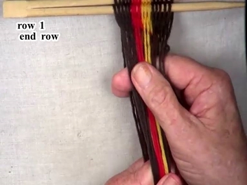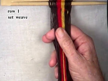 Secure the row 1 of weaving by placing the part 3 weft strand in the top layer of the shed.
