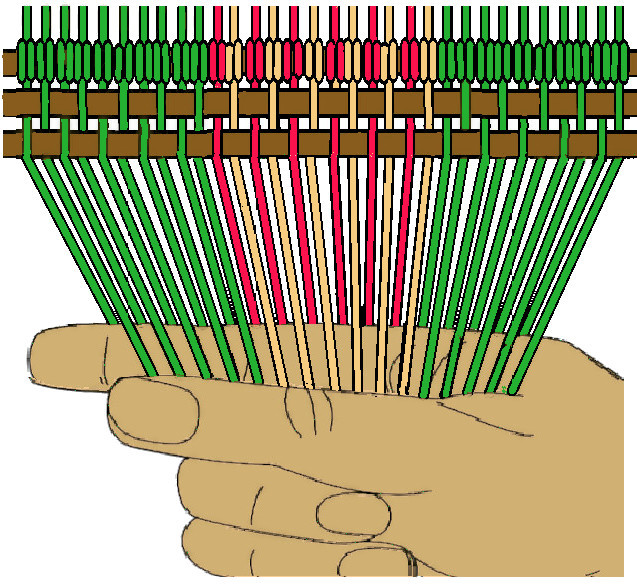 • [NOTE] For each of the following tutorials, the starting arrangement of the warp strands on the headstick is: 10 background color, 12 lightning color, and 10 background color.